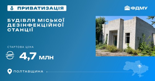 The State Property Fund has put up for privatization a building of the Kremenchuk City Disinfection Station with a total area of 1,273 m² in the Poltava region. The auction will take place in the electronic trading system Prozorro.Sales.