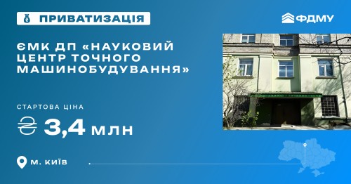 Команда Фонду державного майна оголосила онлайн-аукціон з приватизації єдиного майнового комплексу державного підприємства «Науковий центр точного машинобудування» у місті Київ. Торги відбудуться у системі «Прозорро.Продажі» 27 червня, подання пропозицій для участі у торгах приймаються до 26 червня 20:00.