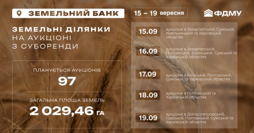 Загалом з 15 по 19 вересня заплановано 97 аукціонів з суборенди державних земельних ділянок сільськогосподарського призначення у межах проєкту Земельний банк. Торги відбудуться в електронній торговій системі Prozorro.Продажі.