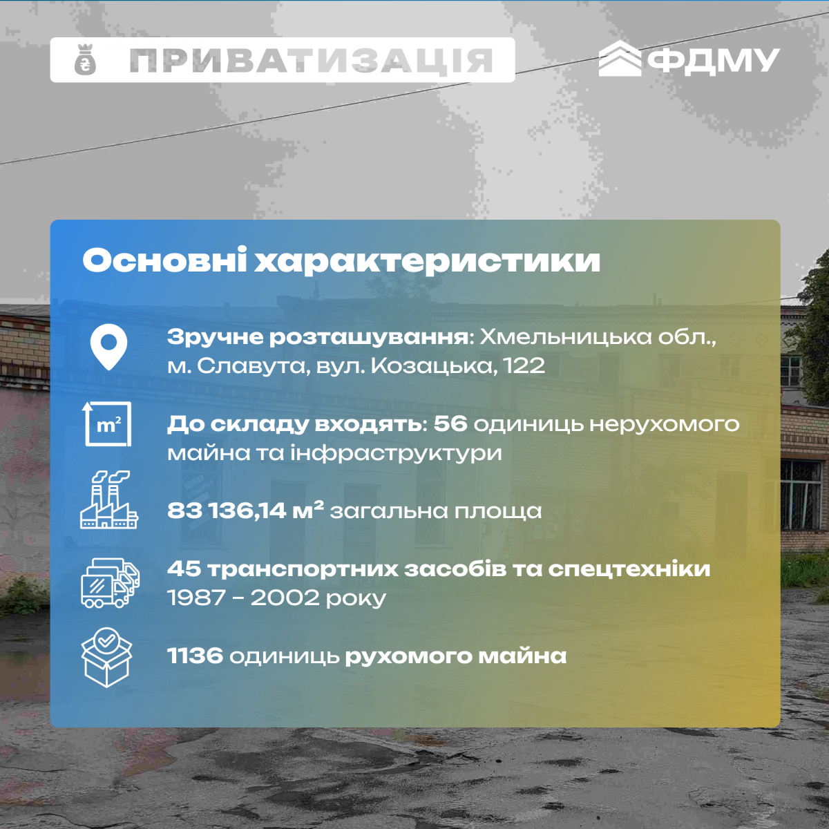 - 56 одиниць нерухомості: виробничі цехи, адміністративні будівлі, склади та розвинена інфраструктура.
