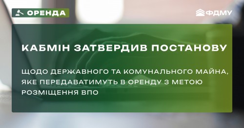 Кабінет Міністрів України ухвалив проєкт постанови «Про внесення до деяких постанов Кабінету Міністрів України змін з питань забезпечення тимчасового проживання внутрішньо переміщених осіб», яку розробили команда ФДМУ з метою врегулювання передачі в оренду державного та комунального майна державним та комунальним підприємствам, громадським об’єднанням та благодійним організаціям для забезпечення тимчасового проживання внутрішньо переміщених осіб.