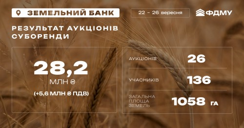 28,2 млн гривень (+ 5,6 млн грн ПДВ) – результати торгів «Земельного банку» цього тижня