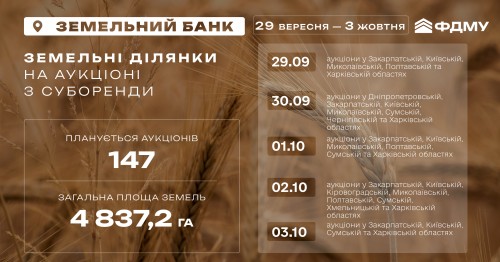 Загалом з 29 вересня по 3 жовтня заплановано 147 аукціонів з суборенди державних земельних ділянок сільськогосподарського призначення у межах проєкту Земельний банк. Торги відбудуться в електронній торговій системі Prozorro.Продажі.