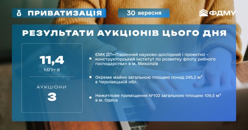 30 жовтня в електронній торговій системі «Прозорро.Продажі» відбулися три успішні онлайн-аукціон з приватизації. Загальна сума цінових пропозицій становить 11,4 млн гривень. Загалом за право власності на об`єкт змагалося 15 учасників.