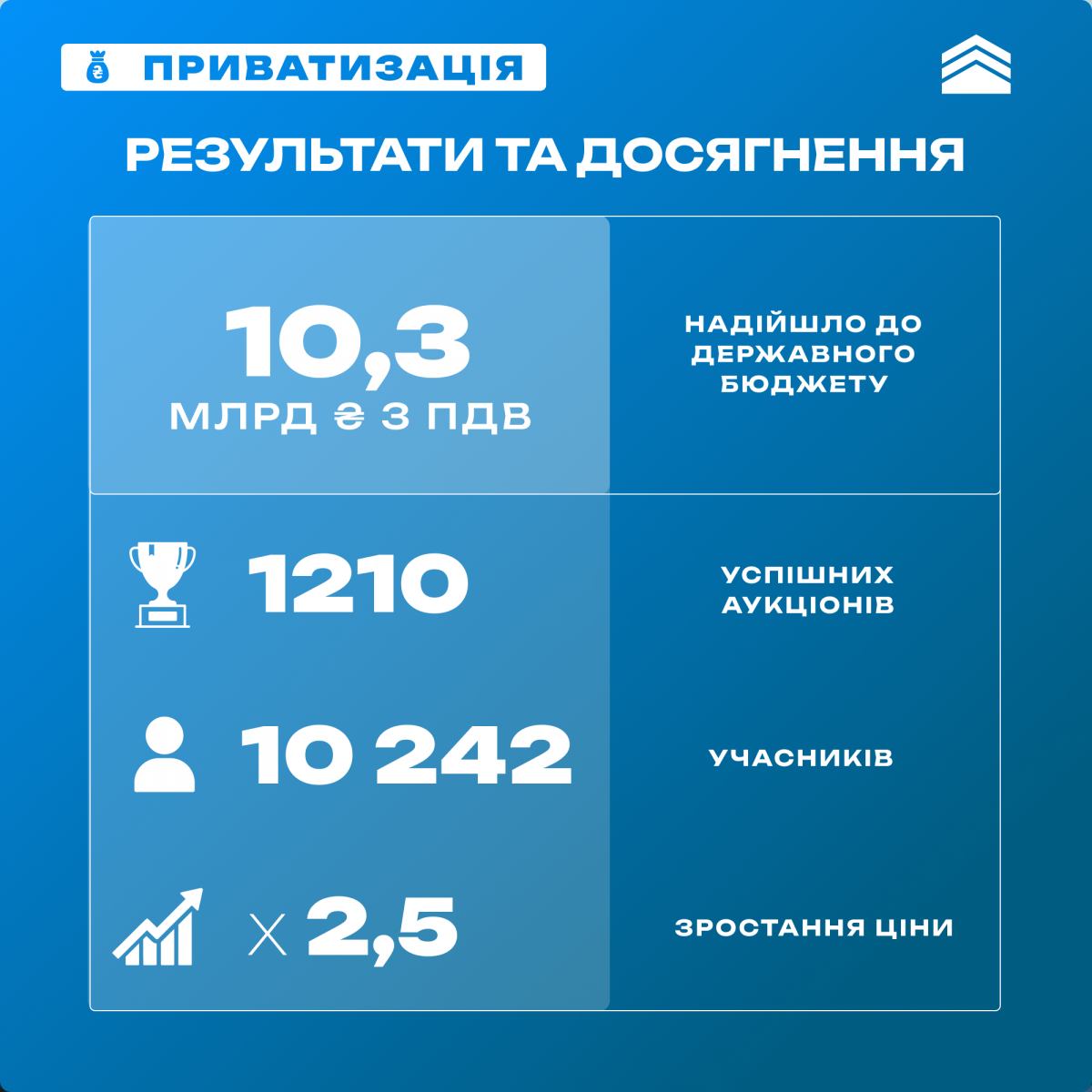 Результати малої приватизації за три роки — з 19 вересня 2022 року по 19 вересня 2025 року підтверджують ефективність приватизаційних процесів. Протягом трьох років з моменту відновлення малої приватизації успішно проведено 1210 приватизаційних аукціонів, за якими було укладено договори. Продаж цих об'єктів державної власності приніс до бюджету 8,69 млрд грн прямих надходжень, а з урахуванням податку на додану вартість (ПДВ) загальні фінансові надходження склали 10,3 млрд грн.
