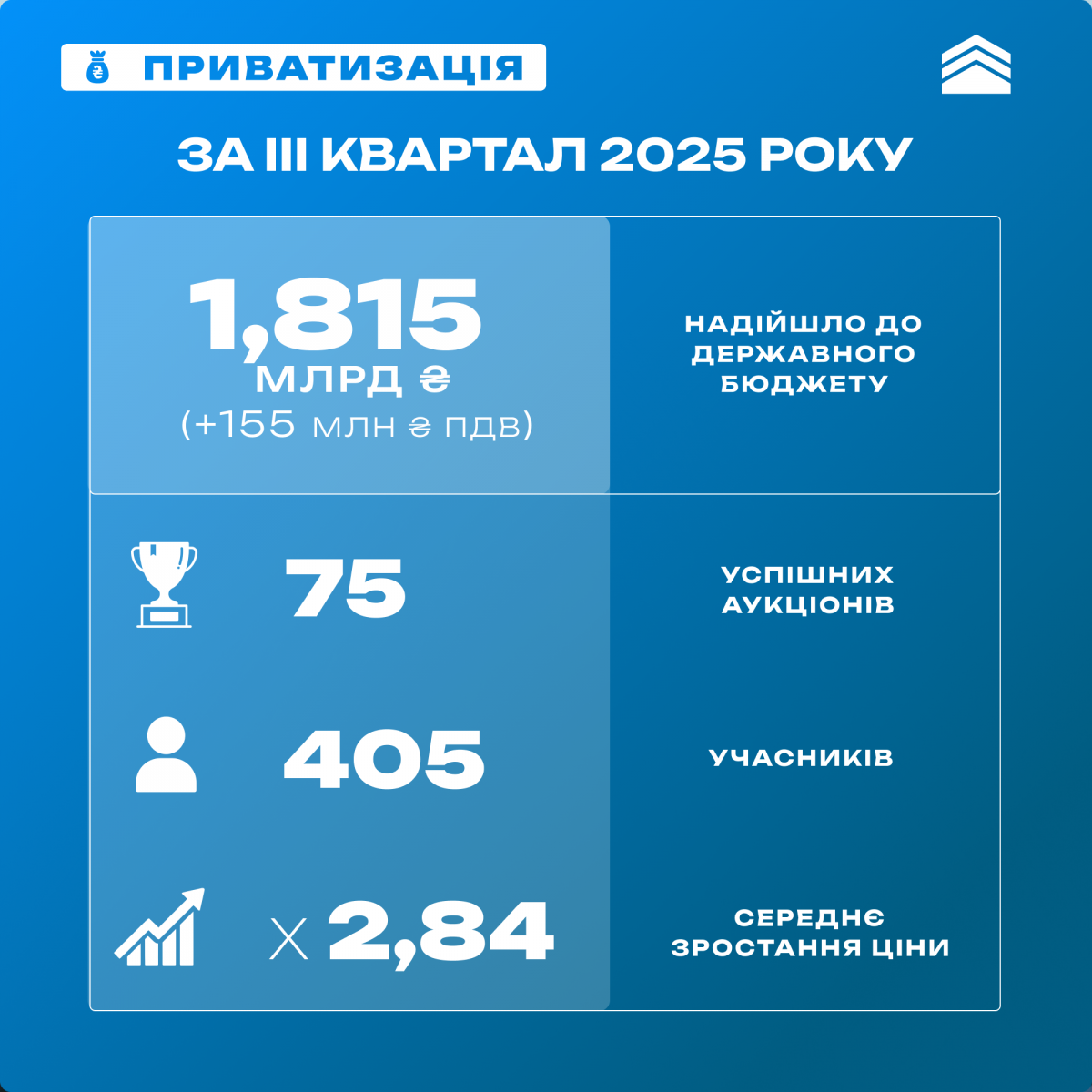 Зокрема, за III квартал команда Фонду держмайна успішно провела 75 приватизаційних аукціонів, у яких загалом взяли участь 405 учасників. Загальна сума переможних ставок за звітний період склала 1,815 млрд гривень (+155 млн грн ПДВ), з них 83 % припадає на єдині майнові комплекси та пакети акцій на загальну суму 1,504 млрд гривень.