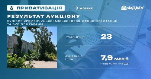 7,9 млн грн (+1,58 млн грн ПДВ) — результат онлайн-аукціону з приватизації будівлі Кременчуцької міської дезінфекційної станції та будівлі гаража у місті Кременчук