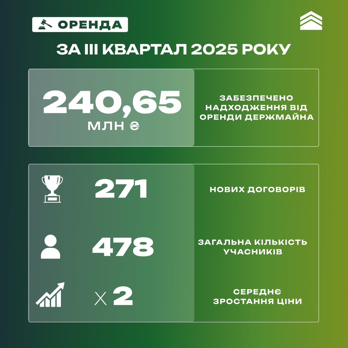 Зокрема, за III квартал 2025 року Фонд держмайна забезпечив 240,65 млн грн надходжень від оренди державного майна. Це на 19 % більше порівняно з аналогічним періодом минулого року. Проведено 345 успішних аукціонів оренди, з яких укладено 271 договорів оренди та по 74 аукціонах очікується підписання договорів оренди на сумму 4,36 млн грн. Загалом 478 учасників взяли участь у торгах. Така активність свідчить про значну конкуренцію та забезпечила середнє зростання ціни майже у 2 рази.