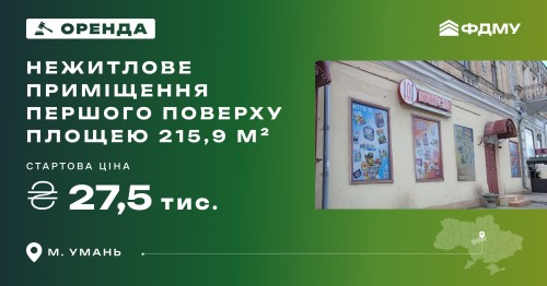 Фонд держмайна оголосив онлайн-аукціон з оренди нерухомого майна – нежитлового приміщення першого поверху загальною площею 215,9 м² у місті Умань. Проведення аукціону заплановане на 24 жовтня в електронній торговій системі «Прозорро.Продажі». Завершення прийняття пропозицій для участі у торгах — 23 жовтня 20:00.