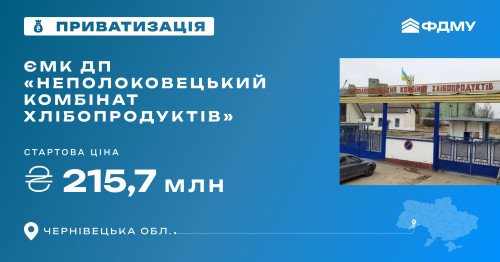 Фонд держмайна України оголосив проведення онлайн-аукціону з приватизації єдиного майнового комплексу державного підприємства «Неполоковецький комбінат хлібопродуктів».Торги пройдуть в електронній торговій системі “Прозорро.Продажі” 30 жовтня. Реєстрація на участь триватиме до 29 жовтня.