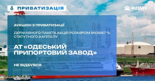 У вівторок, 25 листопада, в системі «Прозорро.Продажі» був запланований аукціон з приватизації АТ «Одеський припортовий завод» зі стартовою ціною 4,49 млрд гривень. Через відсутність зареєстрованих учасників аукціон визнано таким, що не відбувся.