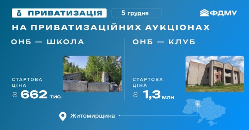 Оголошено два аукціони з продажу об'єктів незавершеного будівництва, розташованих у Житомирській області. Торги відбудуться в електронній системі «Прозорро.Продажі» 5 грудня 2025 року, прийом пропозицій для участі до 4 грудня 2025 року, 20:00.
