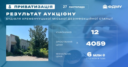 Понад 6 млн грн (+1,2 млн грн ПДВ) — результат онлайн-аукціону з приватизації будівлі Кременчуцької міської дезінфекційної станції