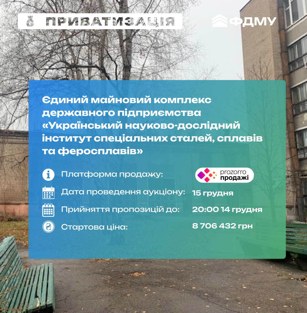 Станьте власником унікального науково-виробничого комплексу в Запоріжжі — беріть участь у прозорому онлайн-аукціоні вже 15 грудня! Інвестуйте в об’єкт із потужним технічним потенціалом та підтримайте розвиток економіки України.
