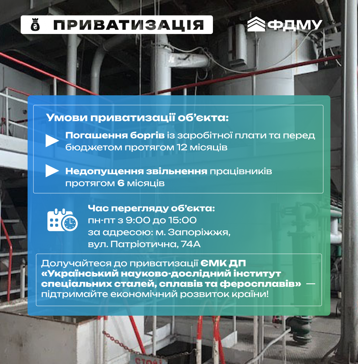 На приватизації ЄМК ДП «Український науково-дослідний інститут спеціальних сталей, сплавів та феросплавів» у Запоріжжі!