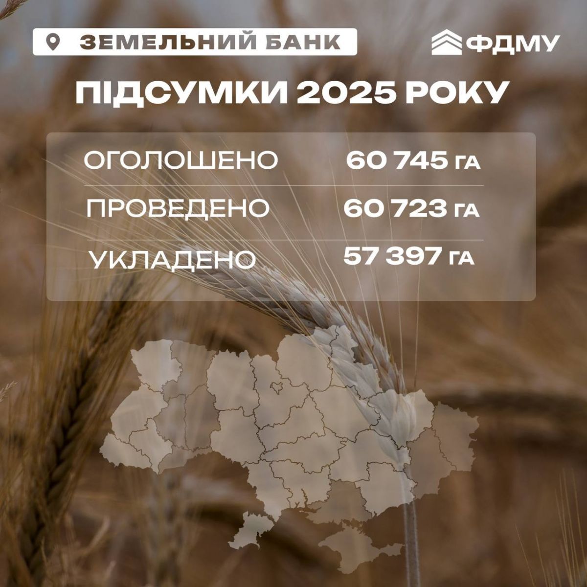За результатами 2025 року, «Земельний банк» виставив на торги 60 745 га держземель в 19 областях України.