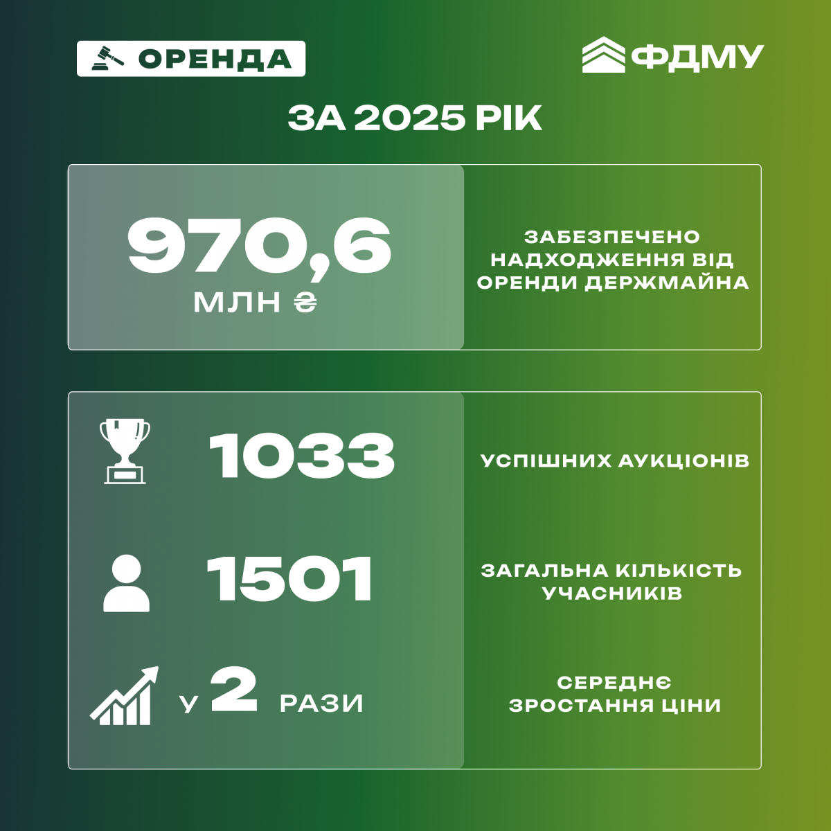 За підсумками 2025 року 970,6 млн грн надійшло до бюджету від оренди державного майна. Це 97,06 % від річного плану. Незначне відхилення від плану зумовлене збереженням низки пільгових умов для орендарів, передбачених законодавством на період дії воєнного стану.