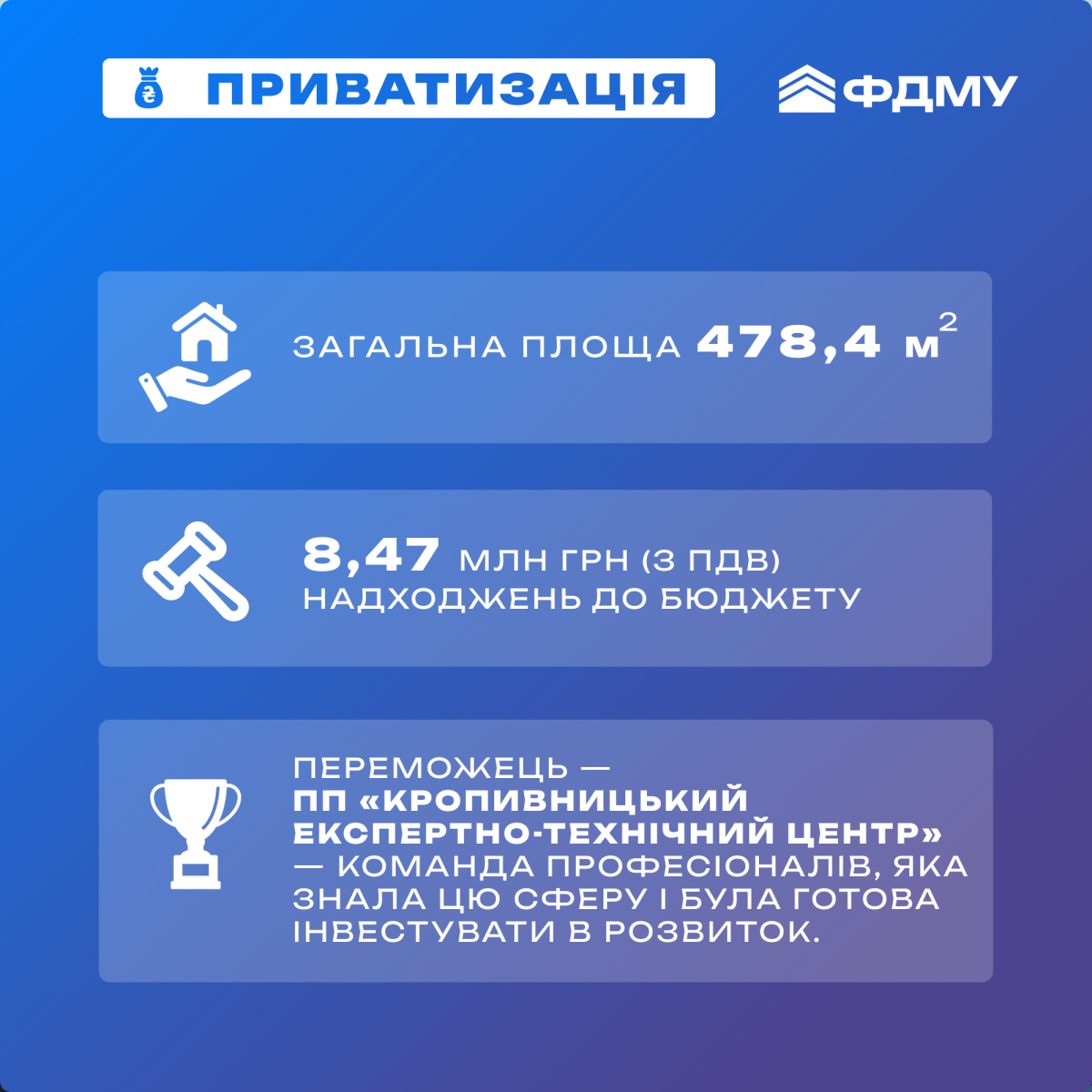 У результаті об’єкт було продано за 8,47 млн грн з ПДВ, і власником стало ПП «Кропивницький експертно-технічний центр» — команда професіоналів, яка знала цю сферу і була готова інвестувати в розвиток.