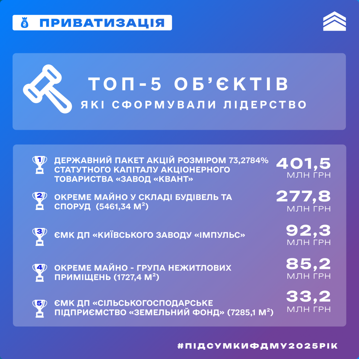 ТОП-5 регіональних відділень ФДМУ за виконанням плану приватизації у 2025 році