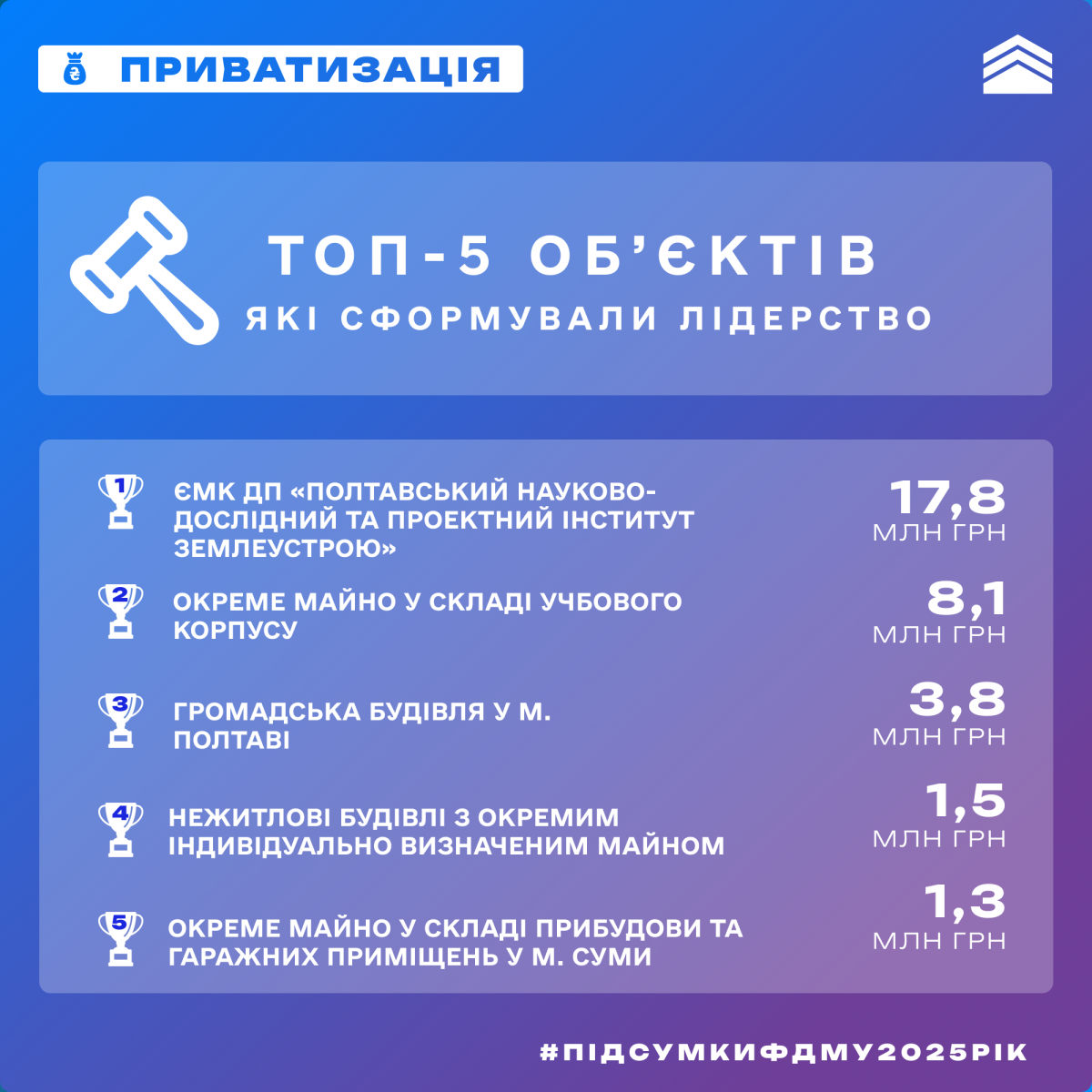 Топ-5 приватизованих об’єктів по Полтавській та Сумській областях за минулий рік: - ЄМК ДП «Полтавський науково-дослідний та проектний інститут землеустрою» у м. Полтаві;