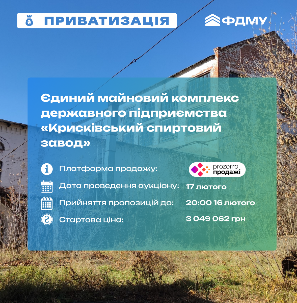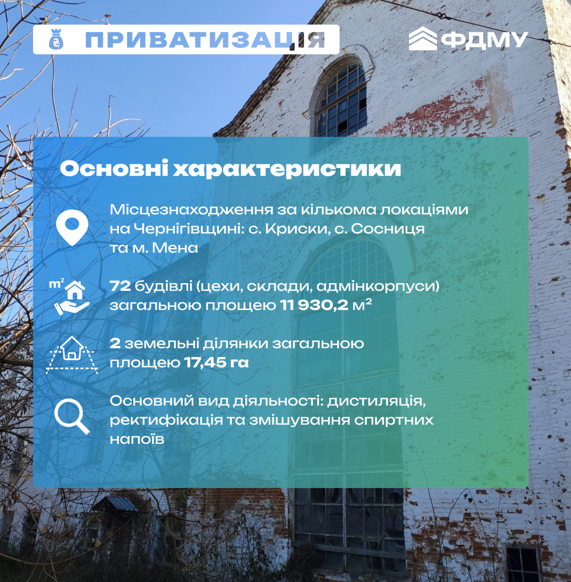 Фонд держмайна оголосив аукціон з приватизації Єдиного майнового комплексу державного підприємства «Крисківський спиртовий завод» на Чернігівщині.