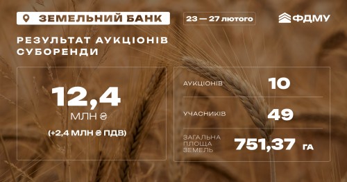 З 23 по 27 лютого у системі Prozorro.Продажі відбулося 10 онлайн-аукціонів суборенди державних сільськогосподарських земель. Лоти були представлені у Полтавській, Закарпатській, Харківській та Херсонській областях. Загальна площа представлених ділянок — 751,37 гектарів.