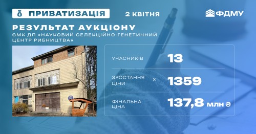 Понад 137 млн грн (+23 млн грн ПДВ) — результат онлайн-аукціону з приватизації ЄМК ДП «Науковий селекційно-генетичний центр рибництва» в Києві